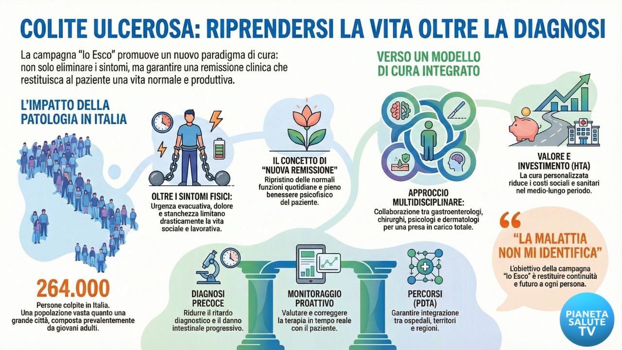 Per dare voce a questa città silenziosa è nata la campagna “Colite Ulcerosa, Io Esco”, promossa da Alfa Sigma insieme ad Amici Italia e con il patrocinio di IG-IBD. Non si tratta solo di un’iniziativa di comunicazione, ma di un manifesto di libertà. Come ha sottolineato l’On. Giorgio Mulè, Vice Presidente della Camera dei Deputati, queste migliaia di persone — in gran parte giovani adulti nel pieno della loro progettualità — non possono essere lasciate sole. Le istituzioni e la clinica devono rispondere con percorsi che non siano solo medici, ma profondamente umani, capaci di accompagnare la persona in ogni passo del suo cammino.