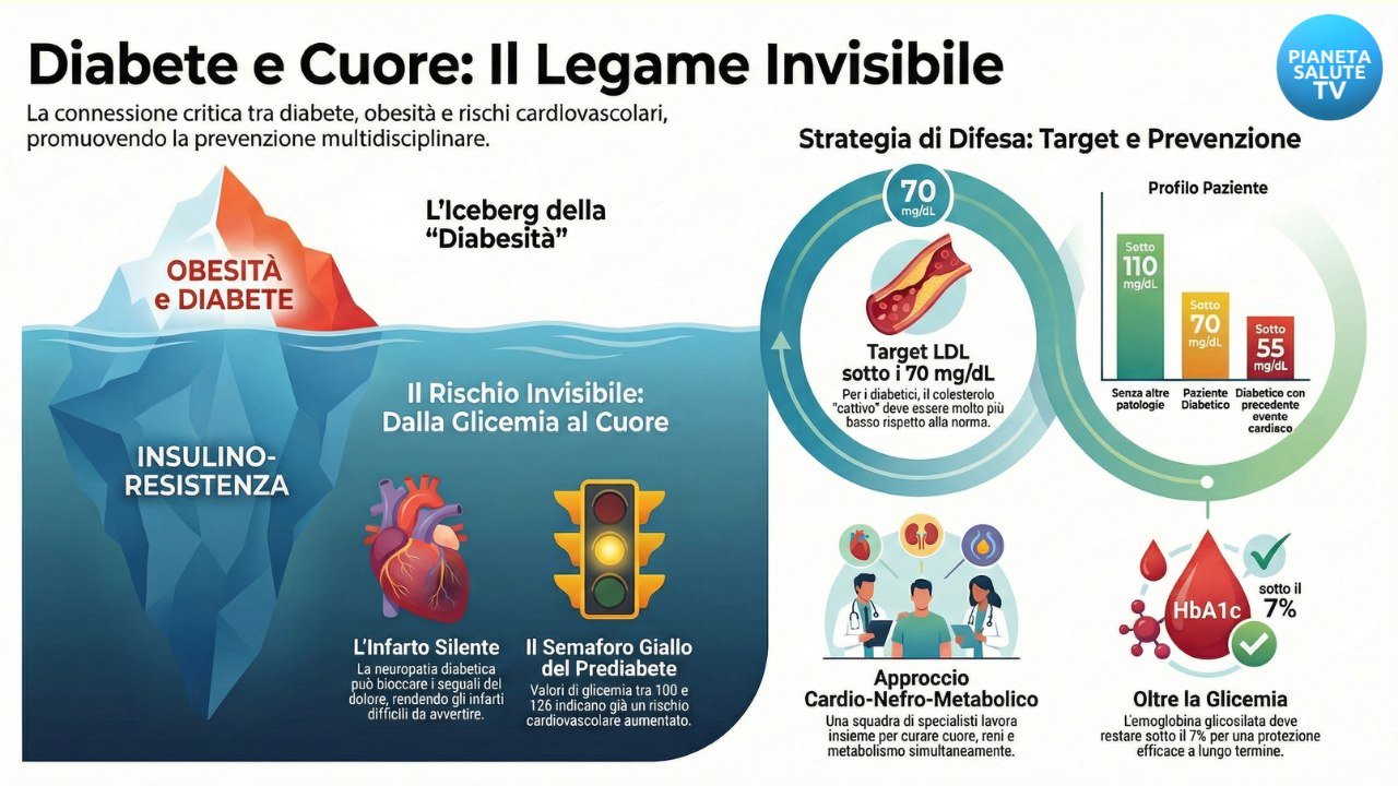 Il diabete aumenta il rischio di infarto e ictus attraverso danni ai grandi vasi sanguigni. La prevenzione cardiometabolica mira a gestire non solo la glicemia, ma anche colesterolo LDL e obesità, utilizzando un approccio integrato che riduce l’infiammazione cronica e protegge il cuore da eventi spesso privi di sintomi evidenti.