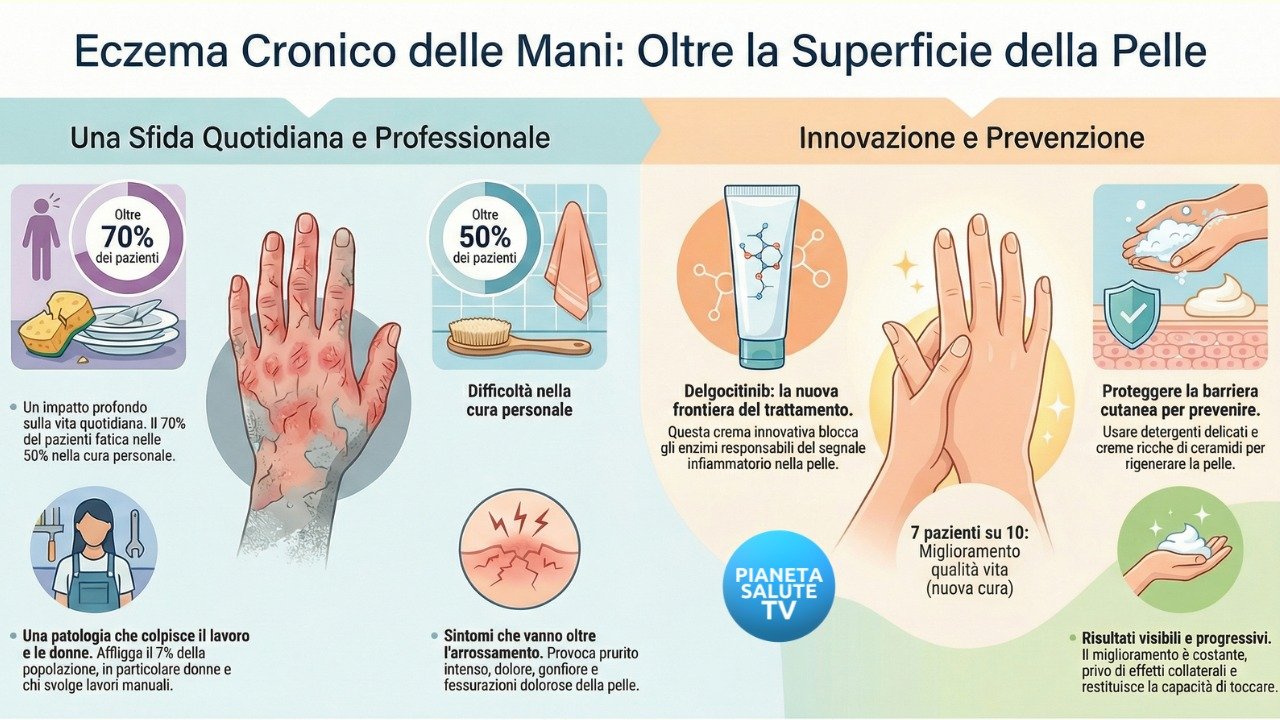 L’eczema cronico delle mani è una patologia infiammatoria che compromette la qualità della vita e la capacità lavorativa. Grazie ai recenti progressi della ricerca dermatologica, oggi è possibile intervenire con inibitori topici mirati che bloccano i segnali dell’infiammazione, restituendo salute alla pelle e funzionalità nei gesti quotidiani.