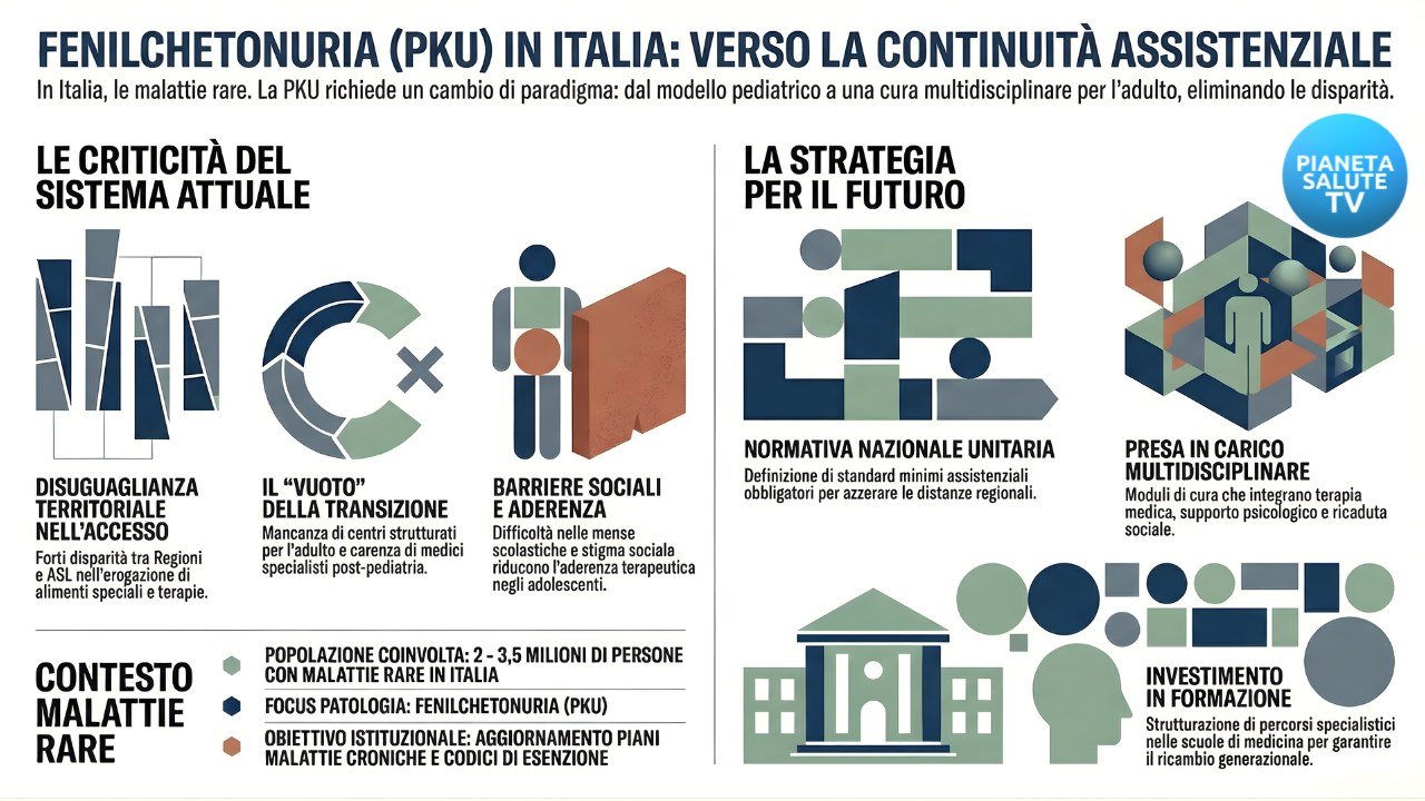 La gestione della Fenilchetonuria in Italia richiede un modello di presa in carico multidisciplinare che garantisca continuità tra l’età pediatrica e quella adulta. Attualmente, le disuguaglianze regionali nell’accesso ai prodotti dietetici speciali e la carenza di medici specialisti per adulti rappresentano le principali barriere al diritto alla salute.