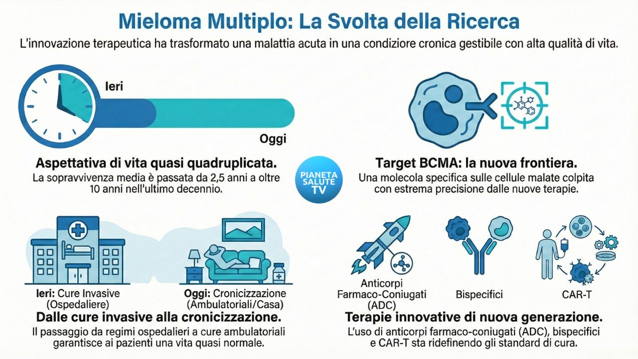 Il mieloma multiplo è una neoplasia ematologica che colpisce le plasmacellule del midollo osseo. Oggi, grazie all’introduzione di anticorpi monoclonali e farmaci innovativi, l’aspettativa di vita è quadruplicata, rendendo possibile una gestione cronica e una migliore qualità della vita per i pazienti.